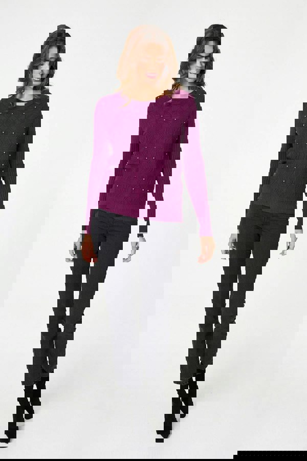 This beautiful embellished jumper has a slim fit, long sleeves and a round neck. It's finished with elegant pearl details and striped knit textures. This jumper is perfect for smart occasions with a midi skirt, or casual occasions with blue jeans and trainers.