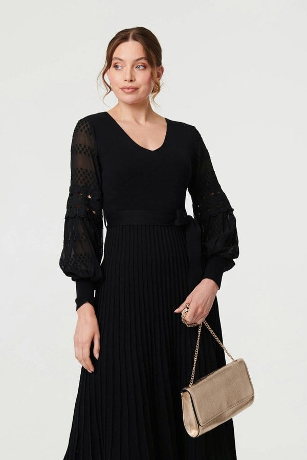 This beautiful dress features semi sheer lace and elegant pleats for a look that's perfect for special occasions. It has floaty puff sleeves, a v-neck and a midi length hem. The bodice is made from a soft knit texture material for extra warmth too. Wear it for an evening out with your favourite black heels to match.