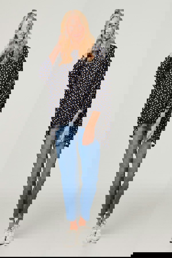 Elevate your casual wardrobe with this oversized polka dot blouse. It has a boat neck, 3/4 sleeves, a relaxed fit and a longline high-low hem dropping to thigh length. Pair with jeans and fresh trainers for a standout off-duty style.