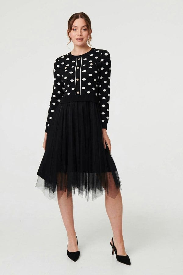 This elegant dress is designed to look like a midi skirt and a cardigan in one. It has a knit top with buttons, long sleeves and a round neck. The beautiful mesh layered midi skirt has a stunning hanky hem and a skater shape. Wear it for a special occasion with boots and tights.