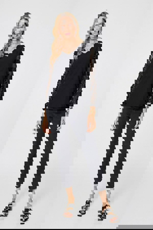 This blouse is perfect for formal occasions. It has a relaxed, flattering fit with a v-neck and a hip length hem. The long puff sleeves are made from a semi sheer material with polka dot details to give an effortlessly put-together look. Wear this blouse with fitted trousers or a skirt for a smart-casual event.