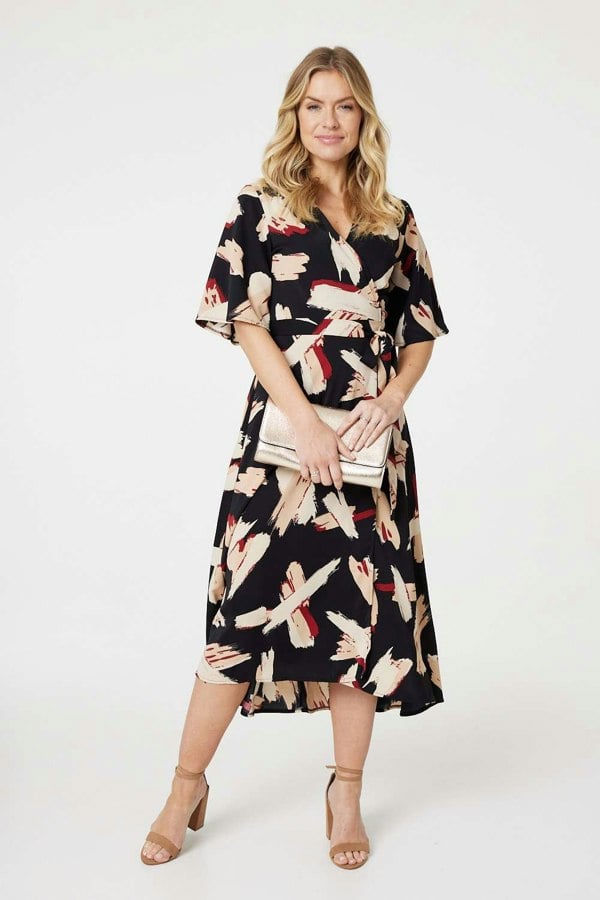 For your next evening or formal event, try this beautiful midi dress. Complete with a v-neck, 1/2 angel sleeves, a tie waist and midi length hem, you're sure to turn some heads. Style with nude or tan heels and a clutch bag. It's perfect for dinners, parties and weddings.