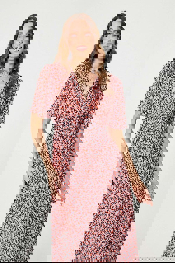 This elegant midi dress has a tummy-flattering ruched panel on the front. It also has a v-neck, 1/2 sleeves and a floaty semi sheer fabric. Pair this beautiful midi dress with heels for a smart-casual dress code, or layer beneath knitwear for a more relaxed look.