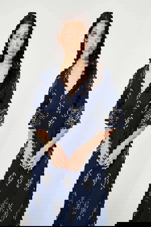 Cut with a considered silhouette, the Izabel London Printed 1/2 Sleeve Shirred Midi Dress brings together a printed finish with softly structured detailing. A v-neckline and 1/2 sleeves keep the look clean and balanced, while the shirred waistband adds definition through the middle.