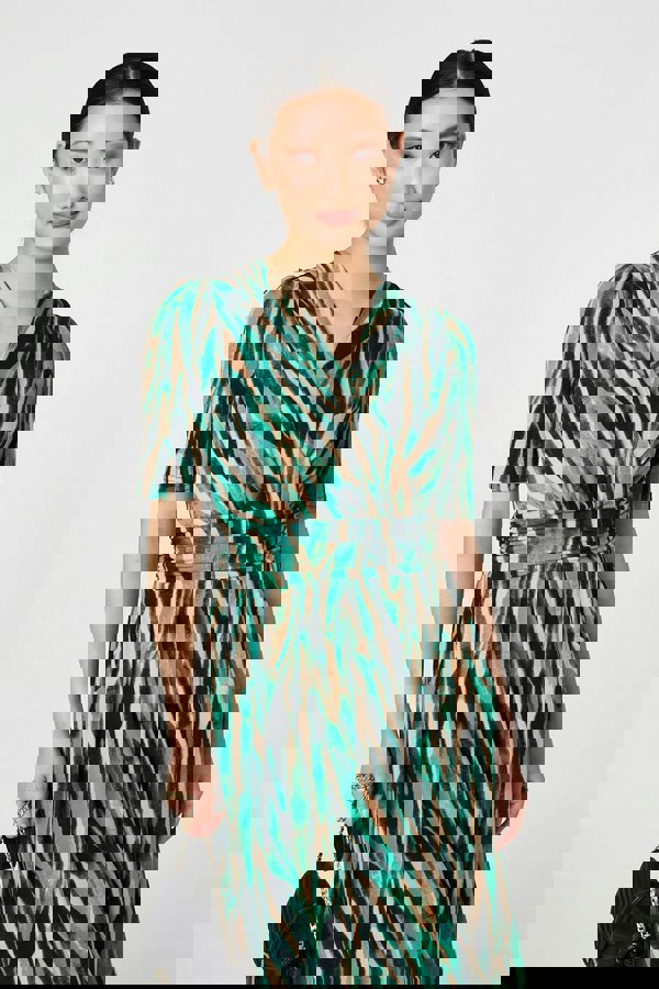 Add this stylish dress to your collection this season. It has short sleeves and a v-neck, with a flattering faux wrap fit and a midi length hem. Style with bare legs and white trainers in the sun, or match with black tights and boots on a cool day.