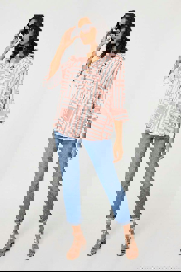 Elevate your blue jeans with this stylish blouse. It has a v-neck with button details and 3/4 flare sleeves for a modern look. The relaxed fit means it compliments all body types for a day at work - or a more formal evening for dinner or drinks.