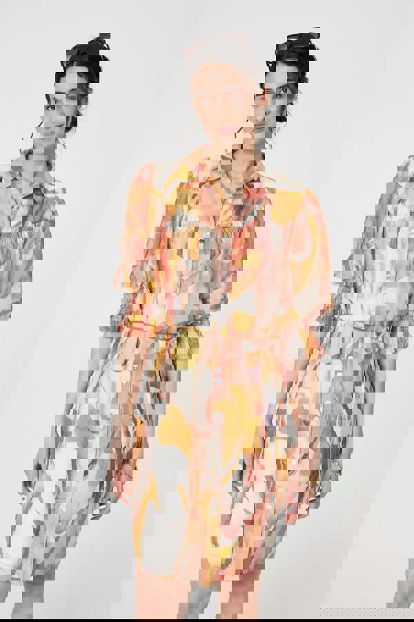This summery shirt dress is sure to brighten up your wardrobe. It has 3/4 puff sleeves and a relaxed tie waist for the perfect fit. Like a classic shirt dress, it has buttons down the front and a knee length hem.