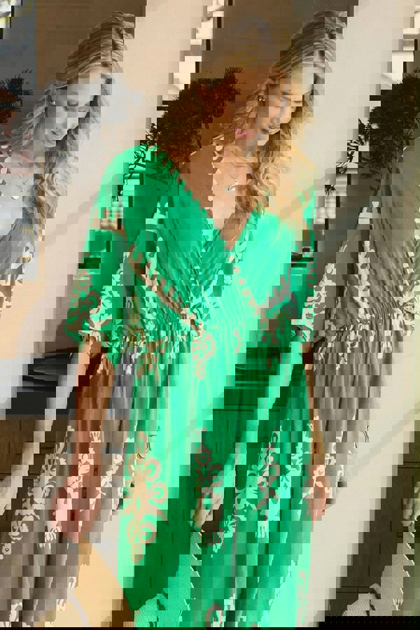 Make a statement wherever your travels take you with this eye-catching printed jumpsuit. Designed with a flattering faux wrap front and deep v-neckline, it creates an elegant silhouette while remaining effortless and comfortable to wear. The batwing sleeves and cinched waist add soft structure, balancing relaxed style with a feminine finish.