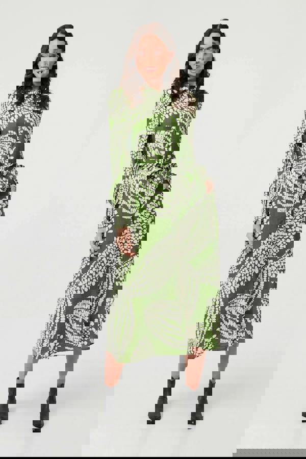 This smart dress will make the perfect addition to your workwear or smart wardrobe. It has long balloon sleeves, a tie waist and a row of buttons on the front, right up to the collared neckline. It has a midi length hem and a slim fit. Wear it with ankle boots or flats for a day at work.