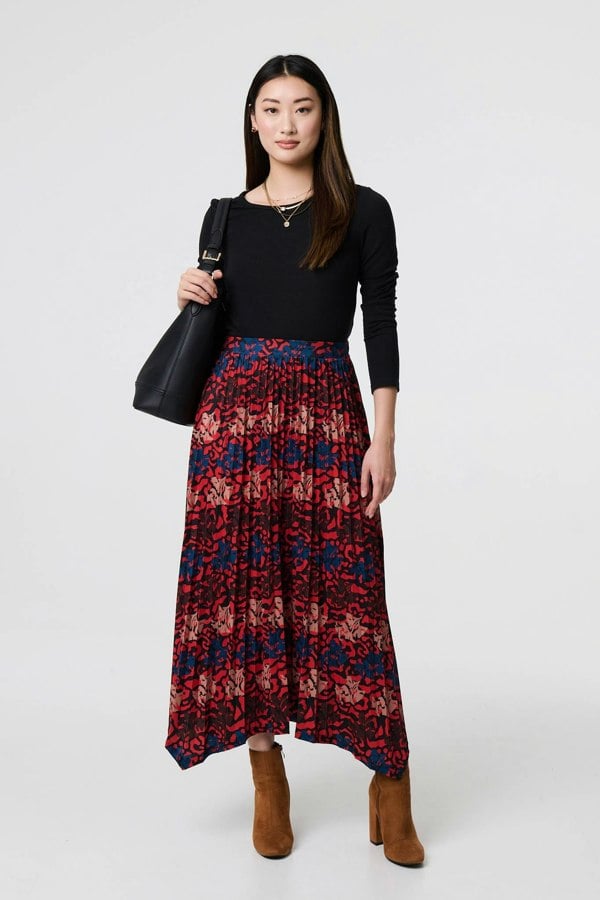 Add a pop of colour to your new season wardrobe with this printed midi skirt. With a high waist, an on trend box pleated fabric, a hanky hem and a midi length. Style with a long sleeve top and heeled ankle boots for an effortlessly stylish everyday outfit.