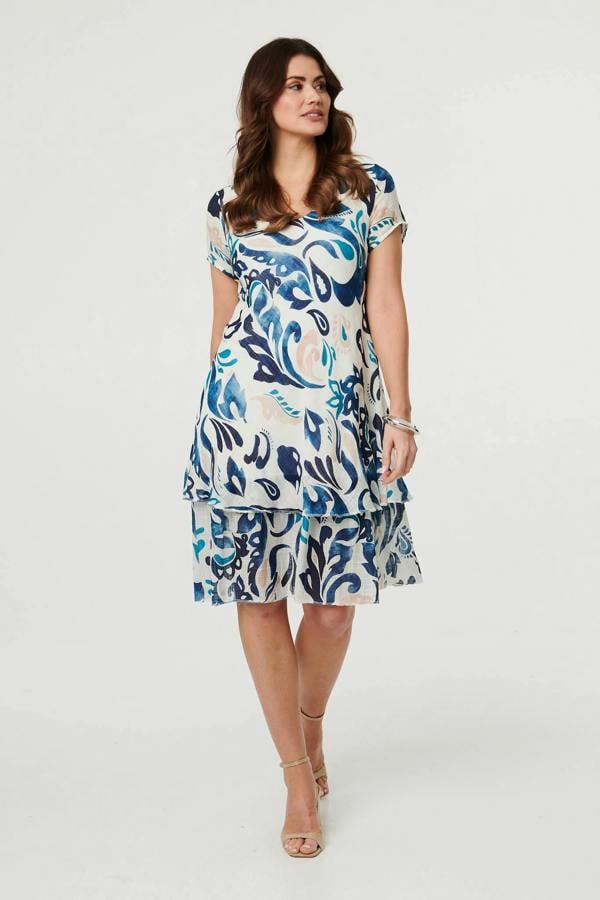 This elegant dress is perfect for both casual and smart dress codes. It has cap sleeves, a v-neckline and a layered hem. The relaxed shape and breathable fabric make this dress perfect for warm weather conditions.