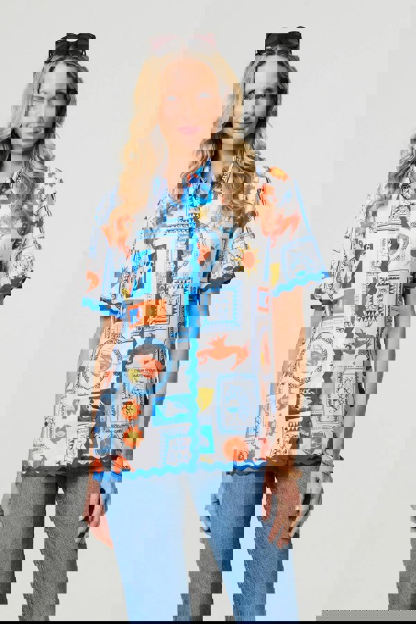 This shirt is a must-have for the summer months. It has a collar and buttons, as well as short sleeves and an eye-catching contrast trim. The relaxed fit and drop shoulders will keep you cool on a hot day, so it's perfect for holidays or summer plans. Wear this shirt loose and unbuttoned over a white vest, or let it make a statement with blue jeans.