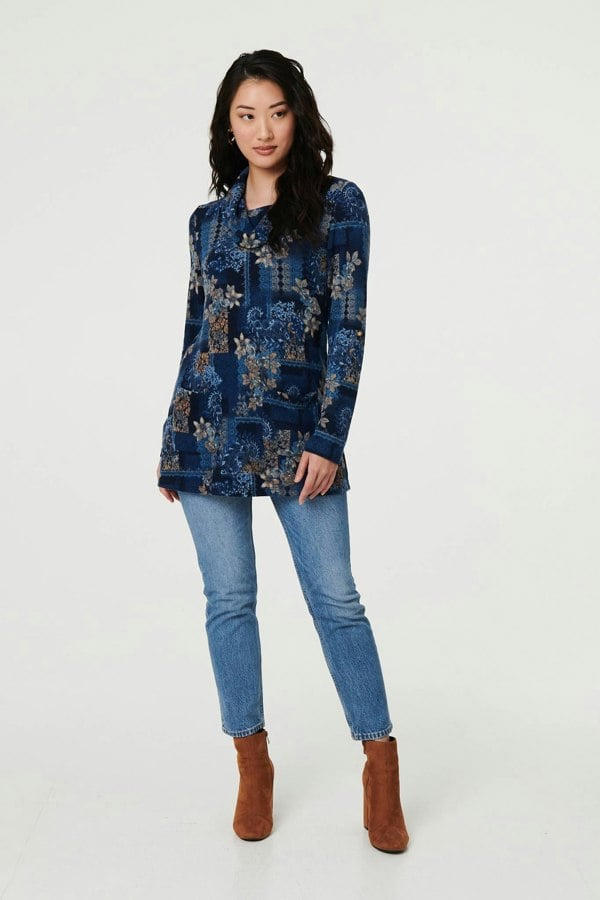 Stay warm on a chilly autumnal day in this comfortable tunic top. It has a cowl neck and cosy long sleeves, with a relaxed fit and a hem that reaches thigh length. It also features handy front pockets. This tunic top looks elegant paired with casual jeans.
