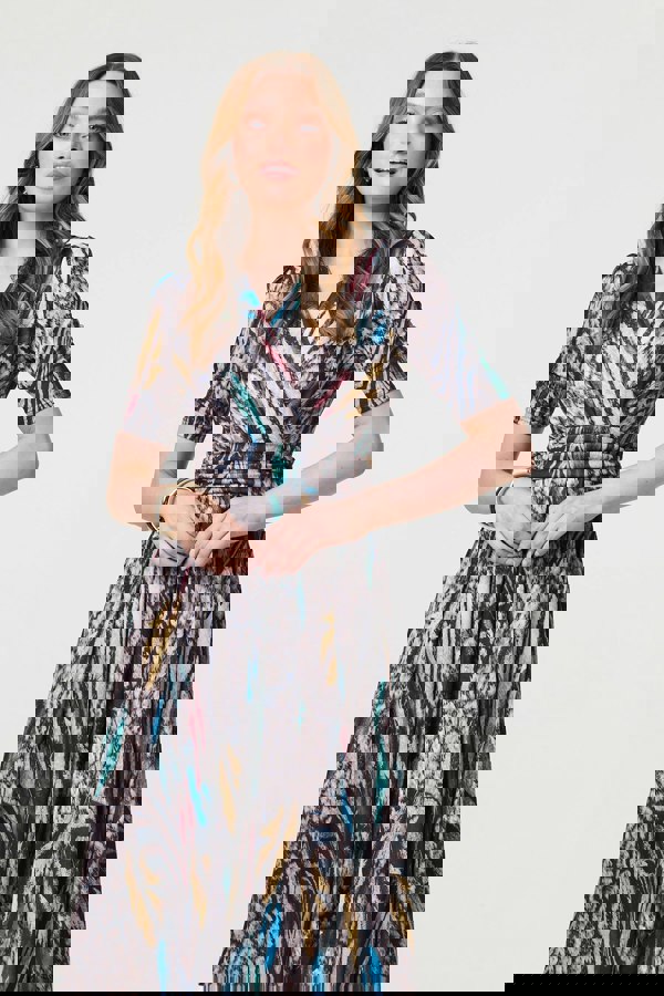 No closet is complete without a bold printed midi dress. With a v-neck, a faux wrap front, 1/2 sleeves, pockets, a ruched panel over the waist and a midi skirt. Style with tights and boots for a chic and comfortable work outfit.