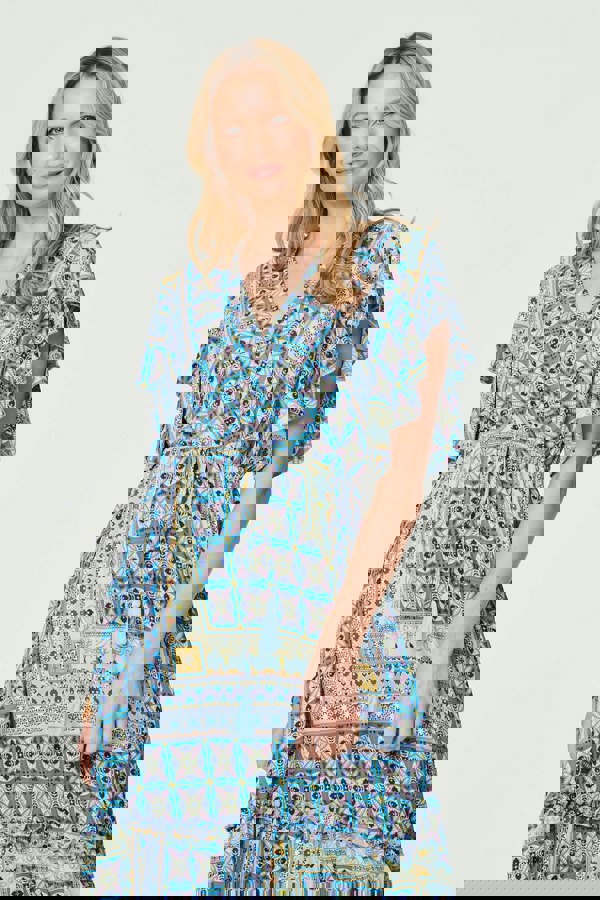 Make a statement with your warm weather wardrobe in this frilled sleeve maxi dress. It has a v-neck, short sleeves with a ruffle detail, a faux wrap front, self-tie waist with a tassel embellishment, pockets and a frilled maxi length hem. Pair with strappy heels for a perfect holiday style.