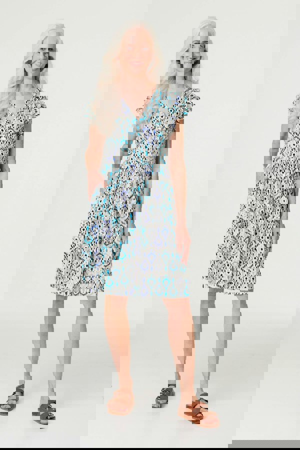 Add an eye-catching print to your warm weather dress collection like this one. With a v-neck, short frilled sleeves, a button front, ruched waist and a short length skirt dropping to knee length. Pair with sandals for a casual look that's perfect for a day in the sunshine.