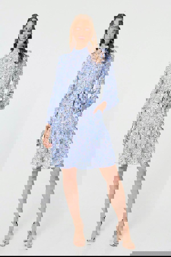 This stylish shirt dress is sure to become a wardrobe staple. It has a high neck with buttons, a tiered shape and a flattering tie front that will cinch in your waist. It also has feminine long puff sleeves and a short length hem.