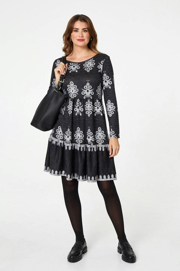 Comfort takes centre stage with the Izabel London Printed Knee Length Long Sleeve Dress. Cut to a knee-length silhouette, it pairs long sleeves with a scoop neckline for an easy, everyday shape. A tiered construction adds gentle movement, while a slight ruffled effect around the neck brings a subtle point of detail.