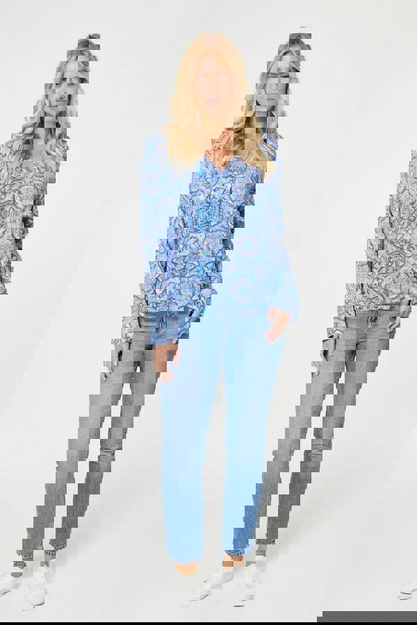 Add a printed blouse to your weekend wardrobe with this collarless relaxed style. It has a v-neck, long sleeves and a curved hip length hem. Made from lightweight viscose, it's the perfect fit for a warm day. Team with fresh trainers and jeans to complete your look.