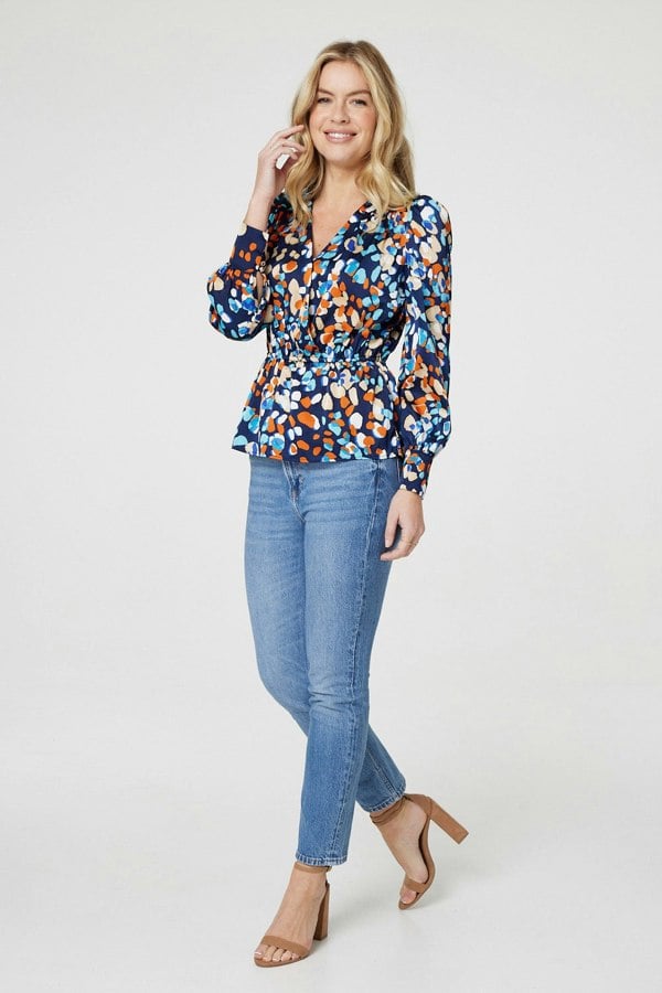 Upgrade your casual look with this satin blouse; featuring long sleeves, a v-neck and a peplum shape. The elasticated faux wrap waist will give you an hourglass figure simply by adjusting the tie. This blouse looks great paired with skinny jeans whether you're out with friends, colleagues or a date.