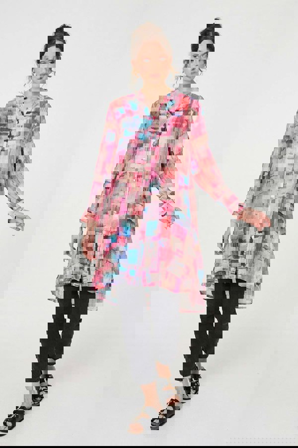 This elegant tunic shirt has a longline fit, with long sleeves and a flattering v-neck. Leave the button-up front loose for a relaxed look over a bathing suit or a cami top this summer. You can also wear it with smart jeans for a more put-together outfit.