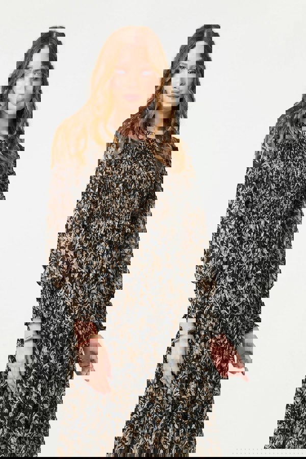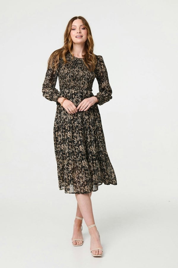 This is your new must-have daytime dress. It has a semi sheer layer and long puff sleeves, with a flattering smocked bodice. Thanks to the elegant fit, you can wear it to any smart event simply by swapping out trainers or sandals for more formal heels or boots.