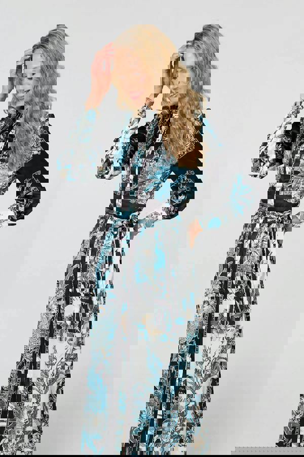 Every wardrobe needs a flattering shirt dress. This one has a maxi length hem, a collar and a tie waist for the perfect fit on your figure. It also features long sleeves, a row of front buttons and an a-line shape.