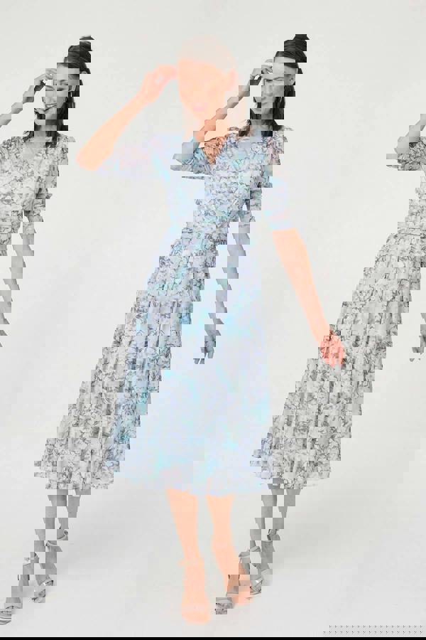 Dress for special occasions in this elegant midi dress, layered with beautiful mesh textured materials. It has 3/4 sleeves, a round neck and a flattering faux wrap shape. It's finished with a ruched waistband and front pleats for a tummy-slimming look - and it even has handy pockets! Wear this dress with heels at your next special occasion.