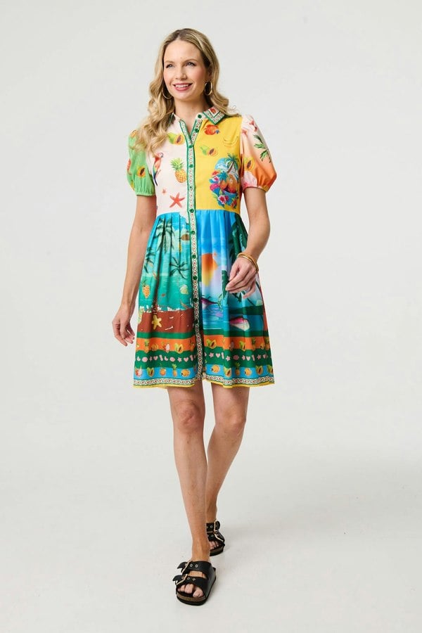 Add a polished yet playful piece to your wardrobe with this printed puff sleeve short shirt dress. Designed with a flattering skater silhouette, it gently flares from the waist to create an easy, feminine shape that suits both smart and casual occasions.