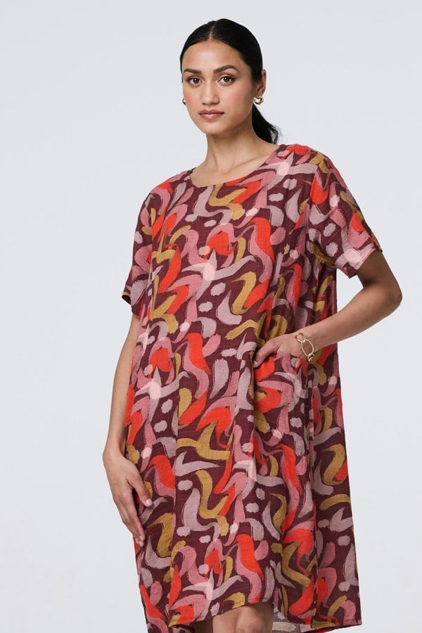 Make a statement in colour in this bold printed shift dress. With a round neck, short sleeves, a loose fit and a knee length skirt. Style with flat sandals for the weekend or dress up with low block heels for brunch.