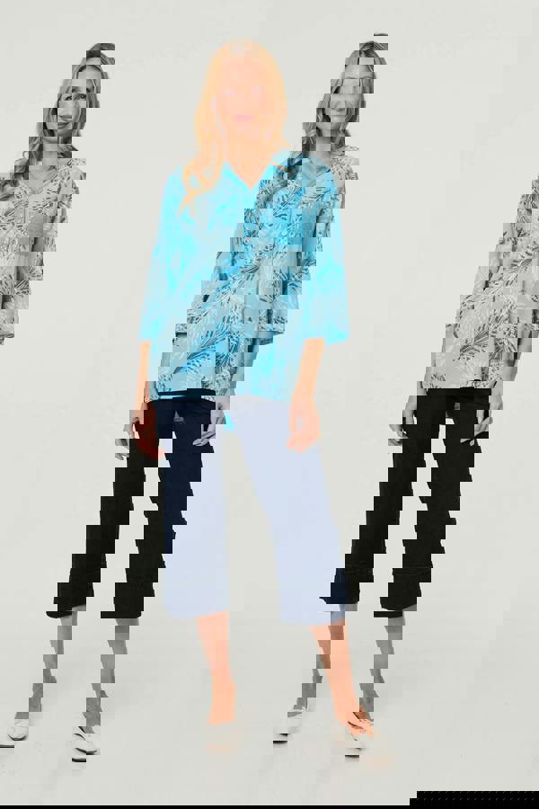 Every wardrobe needs a comfortable relaxed blouse - especially one with a glamorous sequin trim! This blouse has 3/4 sleeves, a thigh length curve hem and a collarless v-neck. It features buttons on the neckline and a cute pocket front detail, finished with sparkly sequins that will shimmer in the light. Dress it down with wide leg jeans.