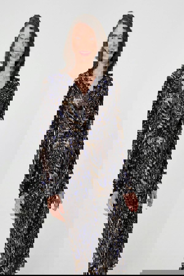 This beautiful midi dress has a flattering wrap front shape, with a shirred waistband to hug your figure. It has long sleeves, a v-neck and a midi length skirt. Wear it with black tights and boots for a smart finish.