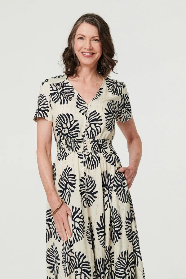 Every wardrobe needs a flattering smock dress. This one has short sleeves, a shirred waistband and a v-neck. It's finished with a ruched maxi length skirt and elegant buttons. Wear this dress with heels and a clutch bag at your next formal event, or keep it more casual with trainers.
