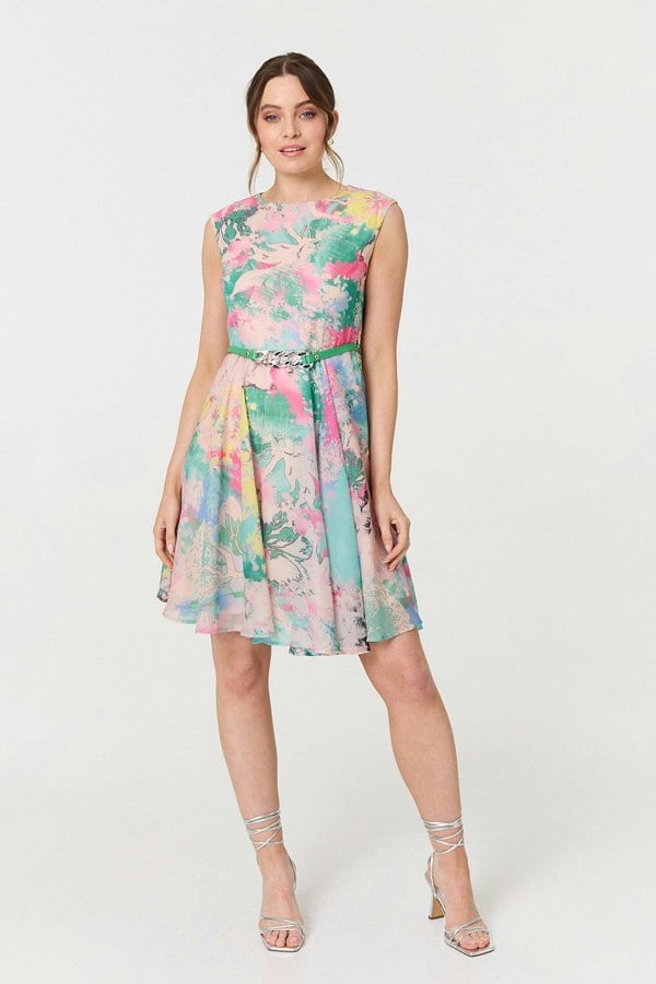 This comfortable short dress has a tummy-flattering skater shape. Get the perfect fit with the belt included and float into any dress code thanks to a versatile short length hem. This dress has a boat neck and a sleeveless shape too. Wear it with heels at your next summer party.