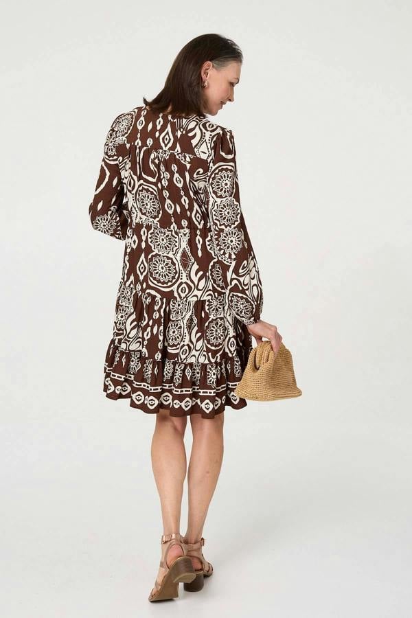 This effortless knee length dress will be your new favourite this season. It has a v-neck, a drawstring tie waist and long sleeves. The tiered shape will give your outfit a relaxed look, ready for any weekend or weekday occasion.