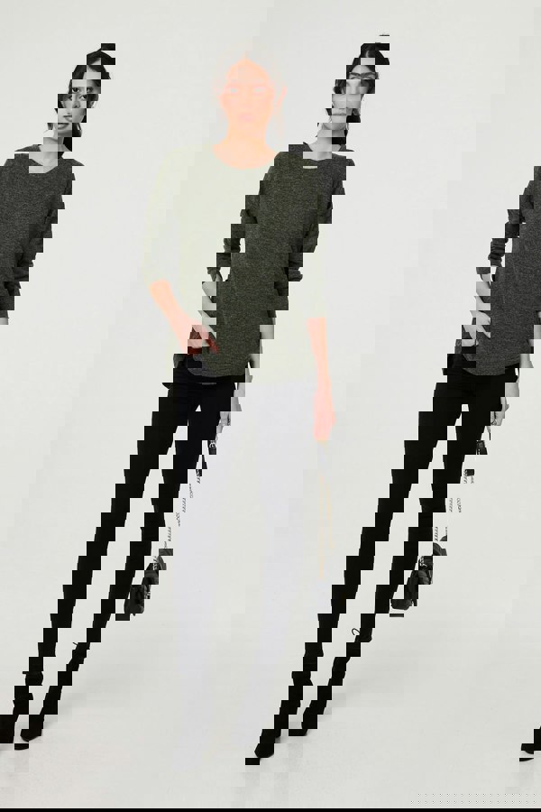 Stay comfortable in this relaxed top. It has 3/4 sleeves and a round neck, with dainty button details and a curved hem. It's perfect for layering over blue jeans on a casual day, or elevate it with a pencil skirt for a day at the office.