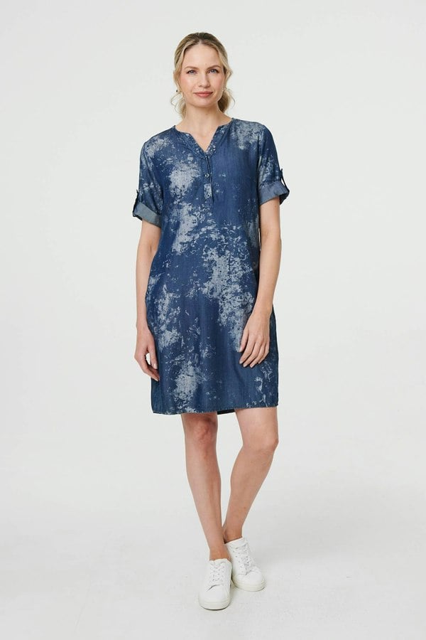 Keep it casual with this elegant short dress. It has a relaxed shift shape with turn-up 1/2 sleeves and classic buttons down the v-neck. Wear it with trainers for a laid-back look that's perfect for casual days out.