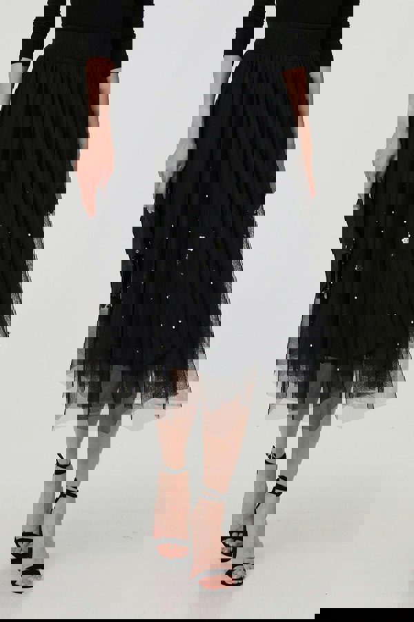 This clever skirt can be worn two ways - as a knitted skirt with a mesh underlayer, or a sparkly mesh skirt. Simply reverse it to get both styles! The mesh side has beautiful sequin embellishments, a hanky hem and a semi sheer look. The knit side has an a-line shape with pleats - and the mesh hanky hem is visible underneath. This skirt is the perfect way to take your look from day to night - or to maximise your wardrobe space! Wear it to work, parties, formal events and more.