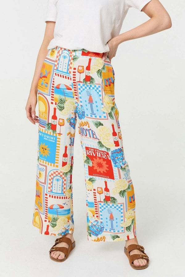 Make a stylish statement in these riviera inspired printed trousers. With a high waist, pockets, a wide full length leg and a pull-on fit. Style with a white t-shirt and strappy sandals for a chic daytime outfit perfect for a sunshine filled destination.