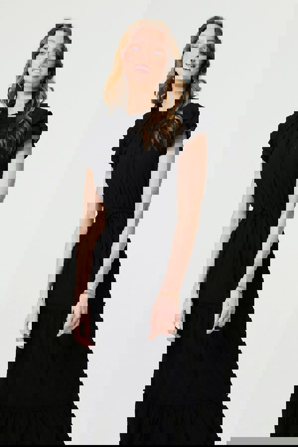 Dress up for a smart occasion in this elegant midi dress. It has frilled cap sleeves and a ruched texture, with a high neck and a tie around the waist for the perfect fit. The elegant tiered skirt will float beautifully around your legs whether you're dressed up with heels for a special occasion, or just spending a day at the office. It's also made from 100% viscose for a comfortable fit, even in hot weather.