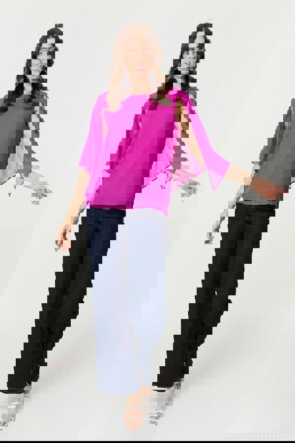 This elegant blouse has cut out panels on the 3/4 sleeves, with a floaty semi sheer texture. Get an elegant finish by pairing this relaxed top with your favourite midi skirt and heels.