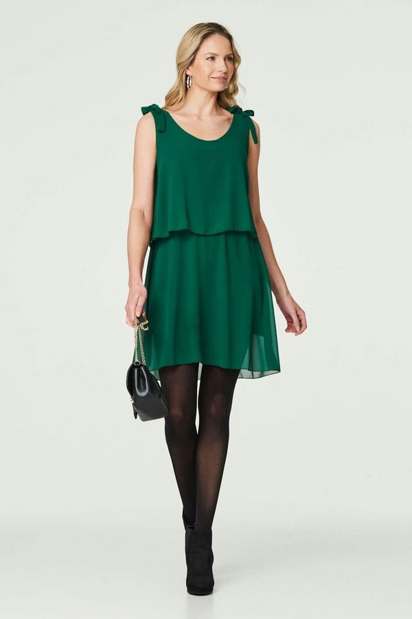 Dress up for a smart casual occasion in this stylish longline tunic top. It has a round neck, a sleeveless fit, tie detail shoulders, and a tiered fit that flatters all body types. The semi sheer material is perfect for both formal and laid back events - just use your shoes and accessories to dress it up or down.