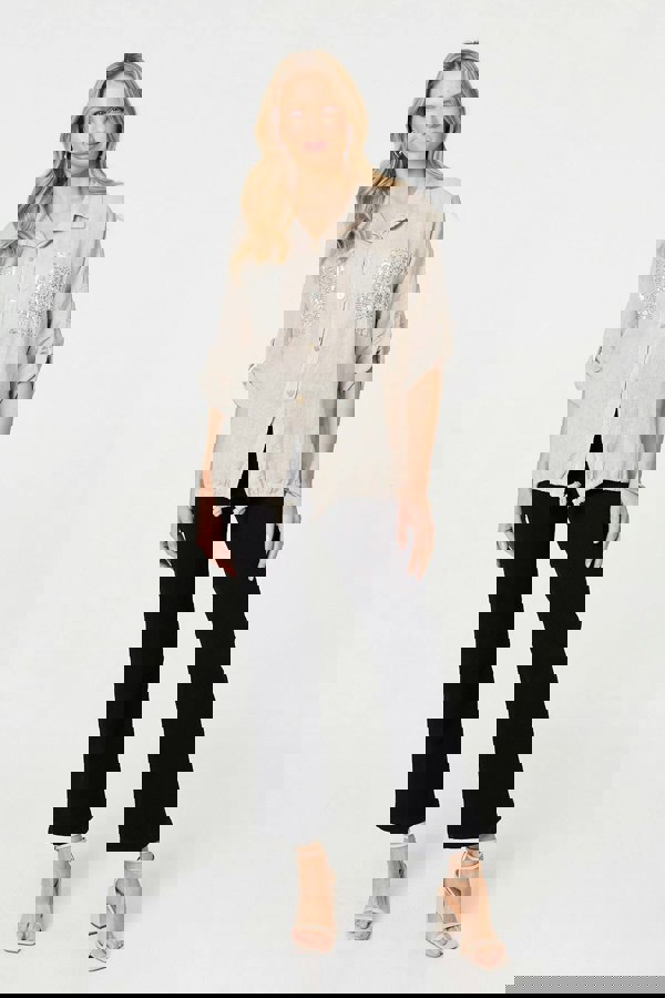 This shirt is made from 100% linen for a super-comfortable fit. It has sparkly sequin details on the pockets, along with a collar, buttons and turn-up sleeves. The drawstring hem will flatter all figures for a relaxed look - but you can pair with a leather skirt for a more formal look that will suit any smart dress code.