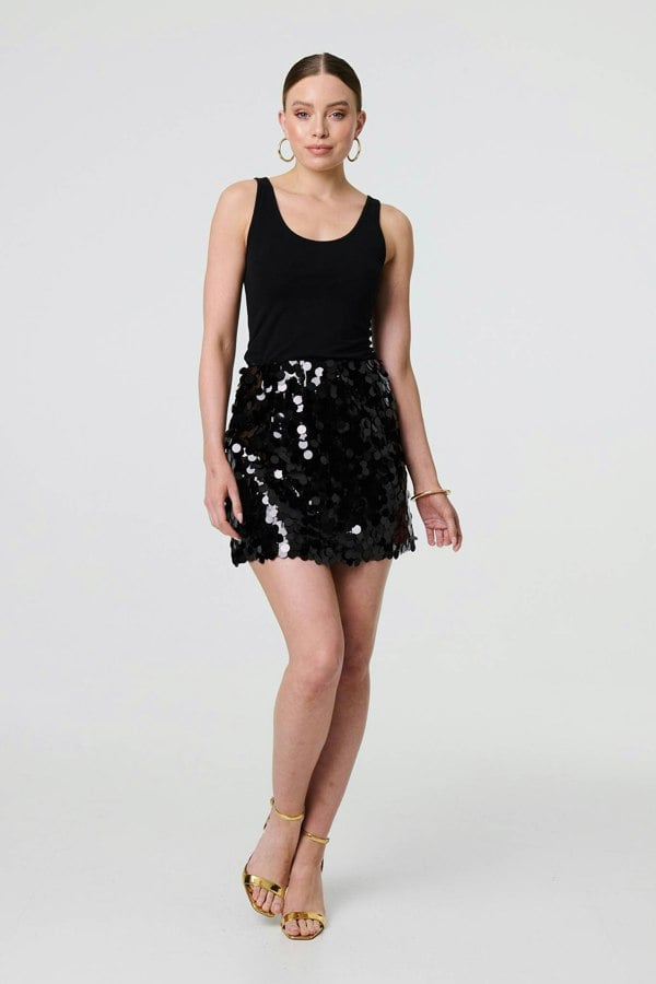 Get ready to party at your next night out with this fun skirt. It's covered in sequins and has a high waist, a mini length hem and a flattering a-line shape. Make it the statement of your outfit by pairing with a plain top.