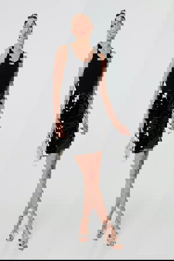 Get ready for a party in this shimmery skirt. It has a high waist and a mini length hem - and it's covered in shimmery sequins! Tuck in a vest top or go for a maximalist look with a ruffled blouse at your next party, dinner or other special occasion.