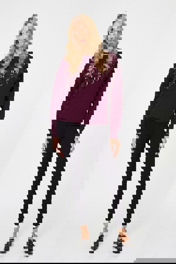 Get an eye-catching look with this shimmery sequinned jumper. It has long sleeves with drop shoulders, a hip length hem and a round neck. Wear it with smart trousers or a black skirt for a smart casual event.