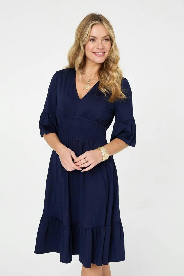 This flattering midi dress has a comfortable shirred waistband for the perfect fit on your figure. It features 3/4 flared sleeves and has a beautiful tiered skirt for a floaty, feminine look. Style this midi dress with your favourite heels for a formal dress code occasion.