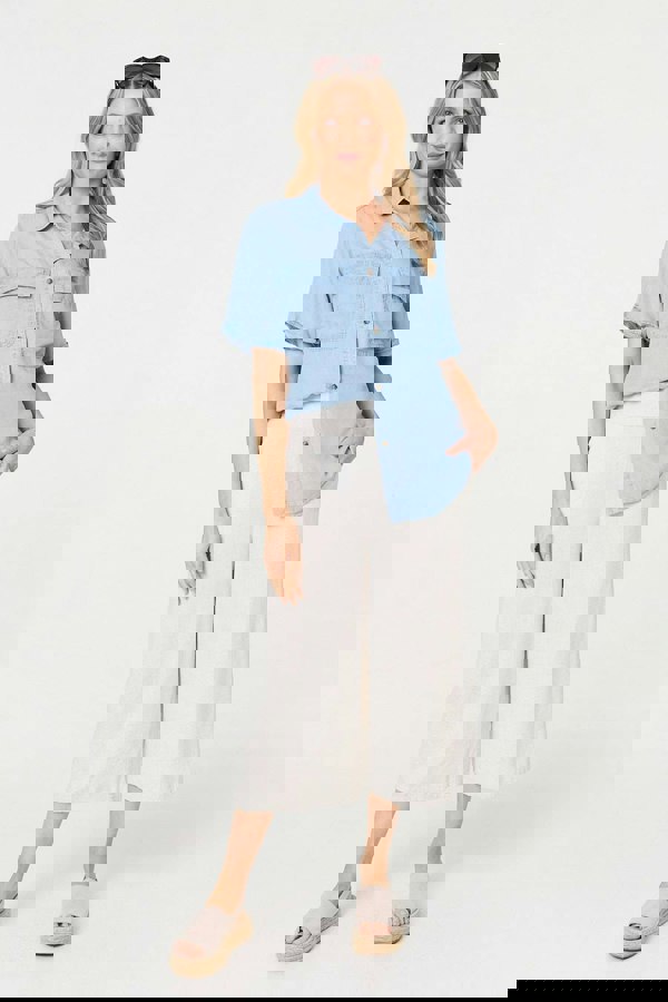 This simple shirt is a must-have for your wardrobe. It has a collar, pocket details and a relaxed boxy fit. The short sleeves and 100% viscose fabric will keep you comfortable, even on a hot day. Just style with your favourite jeans for a casual look.