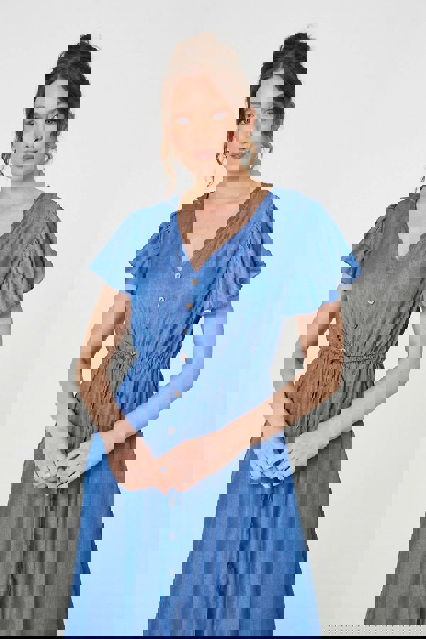 On a casual day out, this dress is a must-have. It has a v-neck and button details down the front, as well as a drawstring waist that will flatter any figure. You'll stay cool thanks to frilled short sleeves, a midi length hem and a relaxed fit. Style with trainers or sandals on a summer day.