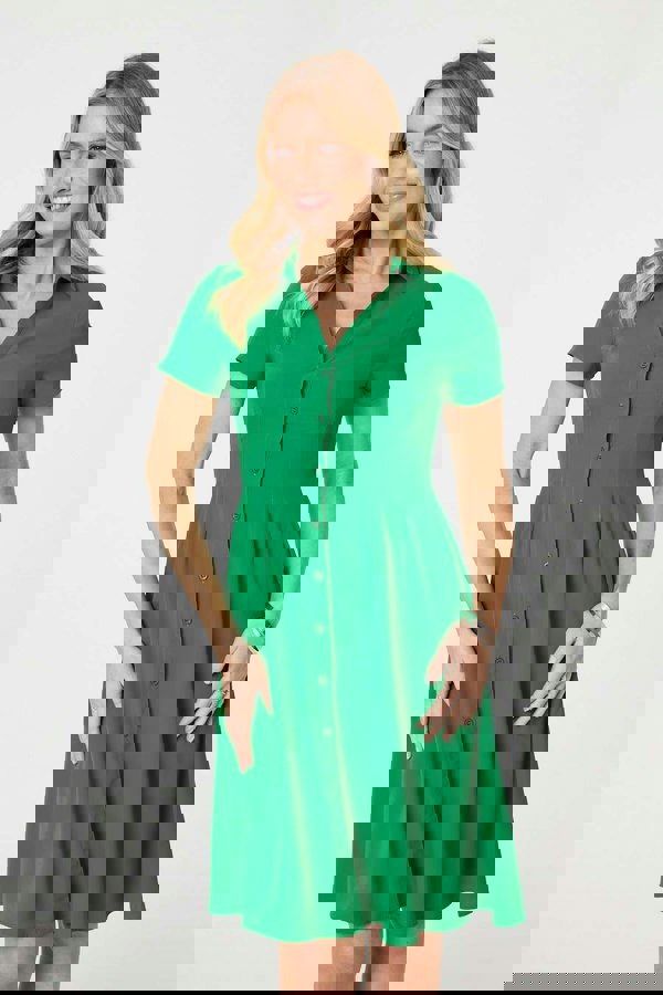 We could all use a few more figure-flattering dresses in our wardrobes. This one has a button-up front with a collar, short sleeves and a knee length hem. The fit & flare shape will give a slimming effect on all body types - so you can feel stylish and confident, whatever the event. Depending on accessories and shoes, you could wear this to both casual and formal events.